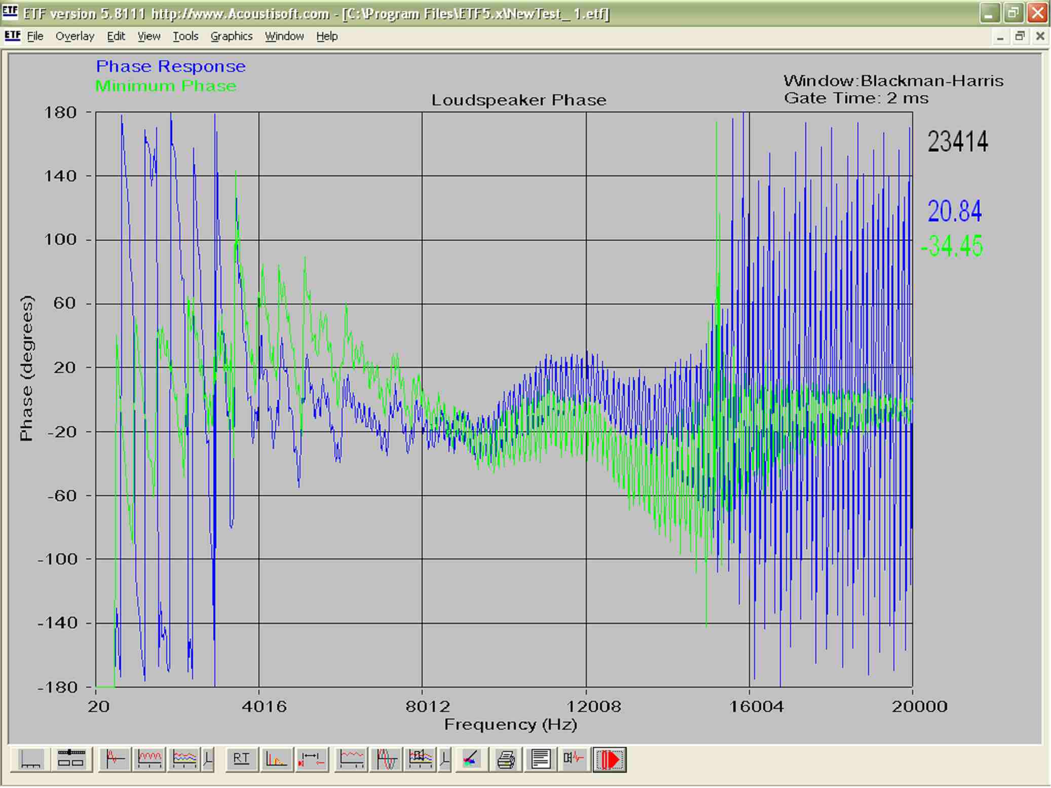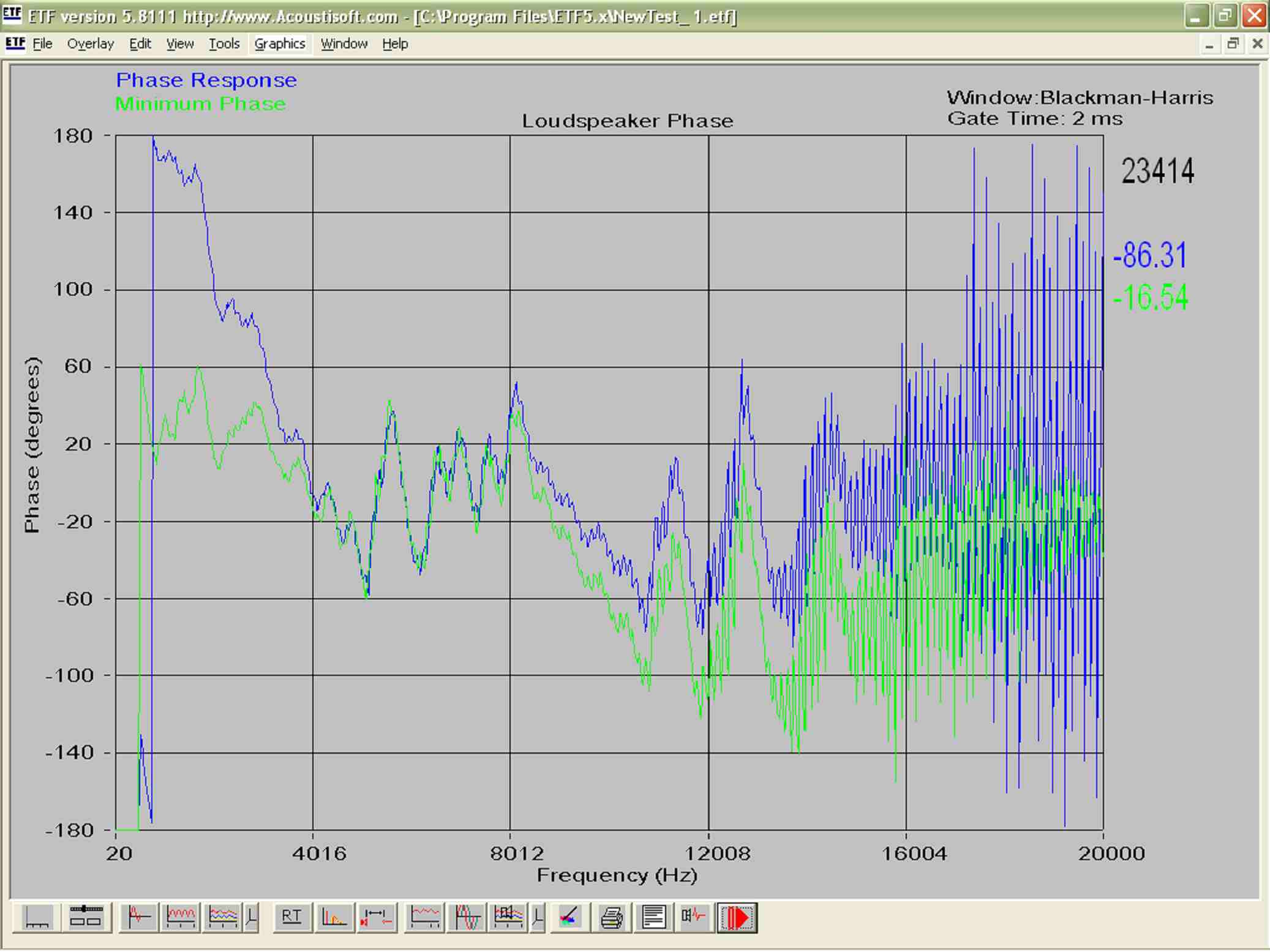 Above by contrast is a high quality Studio Monitor's result(mid-size 2-way reflex made by BOSE) as you can see the pattern is different, and the difference between colours and the irregularity are much more concerning - it is obvious the reflex type of enclosure ruins phase in the bass region while to exaggerate the LF. also note the pronounced breakdown in the vocal frequencies and HF, probably due to poor tweeter performance, crossover distortions, and interactions between drivers. Note: the tests were done repeatedly in controlled conditions during the same minute on the same rig, to ensure the only variable was the loudspeaker connected. |